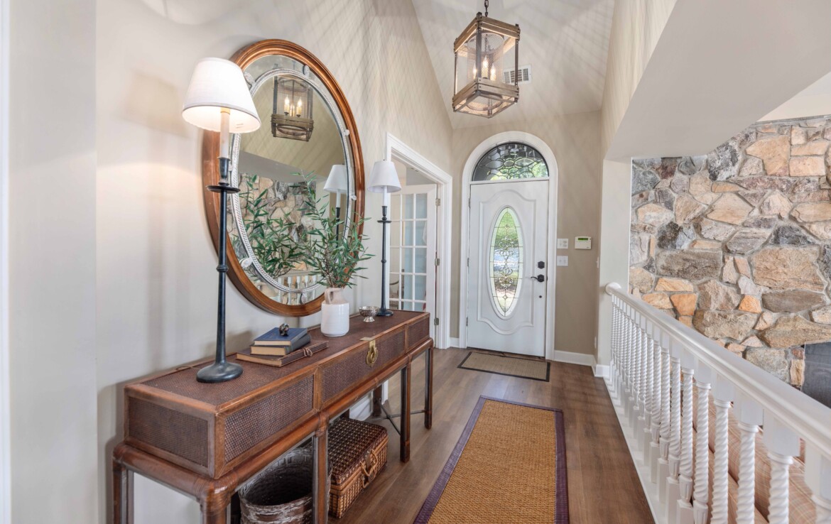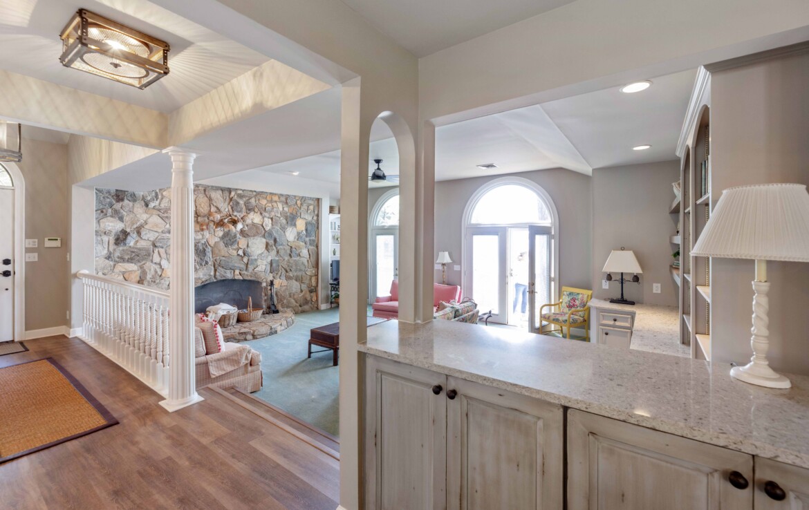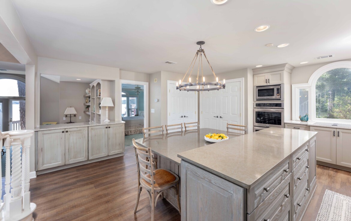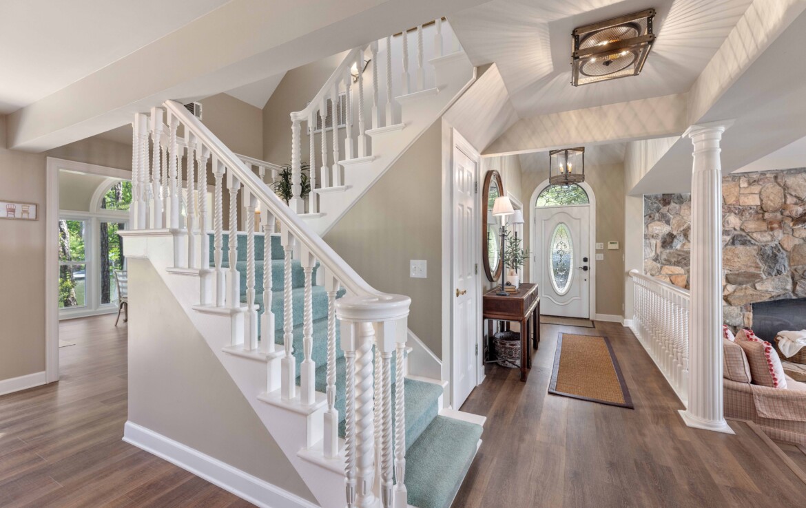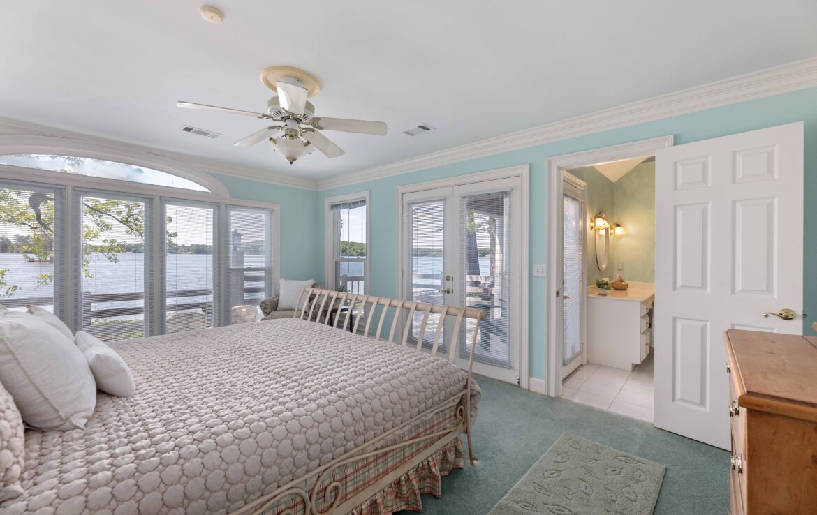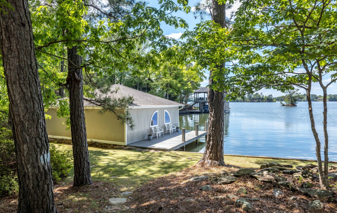 Waterfront home on a 1.34-acre private peninsula with stunning big water views! This spacious 4-bedroom, 2.5-bath home features a fully renovated kitchen with a large breakfast island, double ovens, stainless steel appliances, LVP flooring, and a pantry. The bright, open living room offers a stone fireplace and built-in cabinetry. The main-level primary suite is filled with natural light and showcases beautiful water views, an oversized ensuite with dual vanities, a separate shower and soaking tub, and his-and-hers walk-in closets. The main level also includes a guest bedroom and half bath, while upstairs features two spacious guest rooms with a Jack-and-Jill bathroom. Outdoor living is just as impressive with an expansive deck overlooking the water, double boathouse, concrete seawall, private boat ramp, and two stationary docks—perfect for enjoying lake life to the fullest.