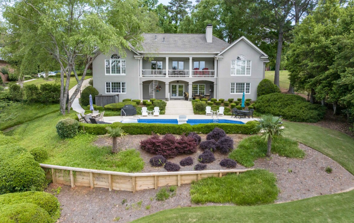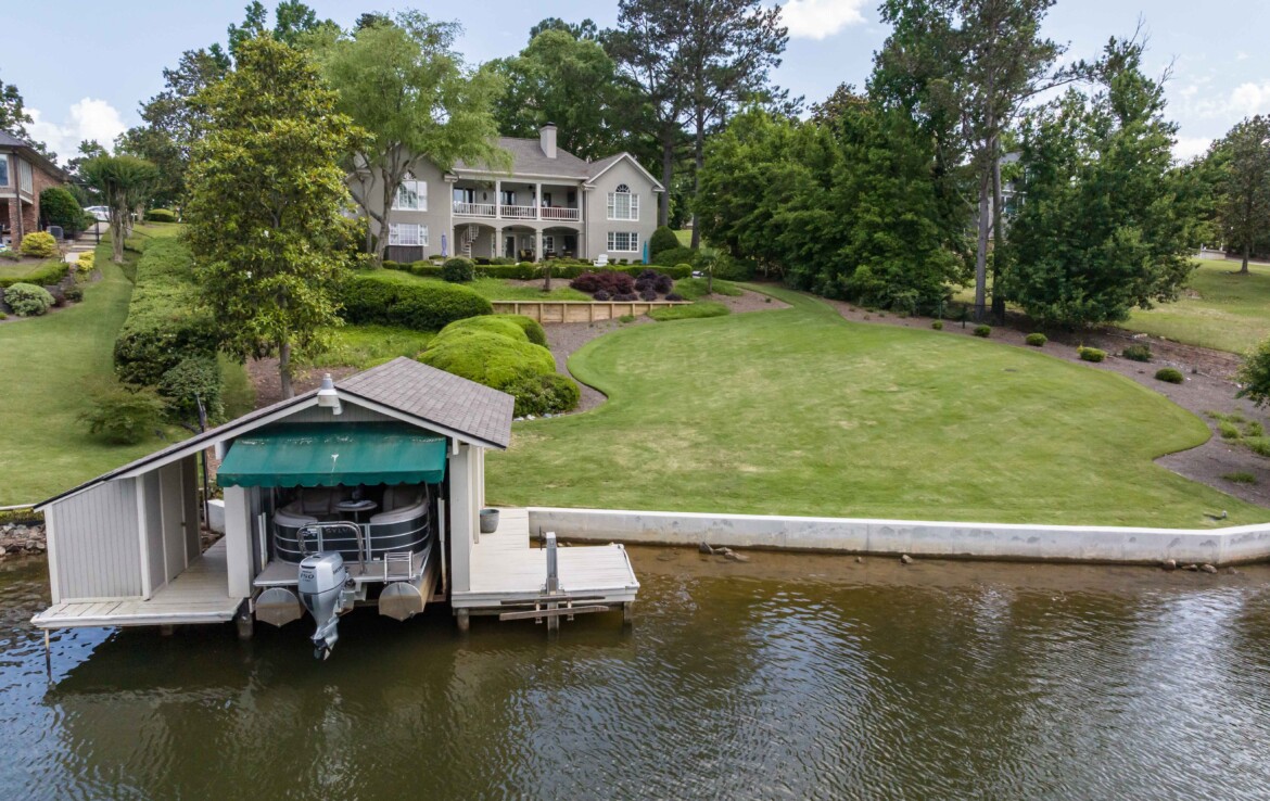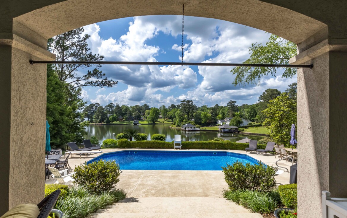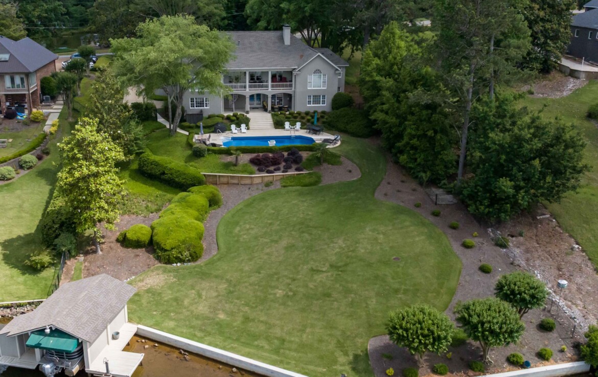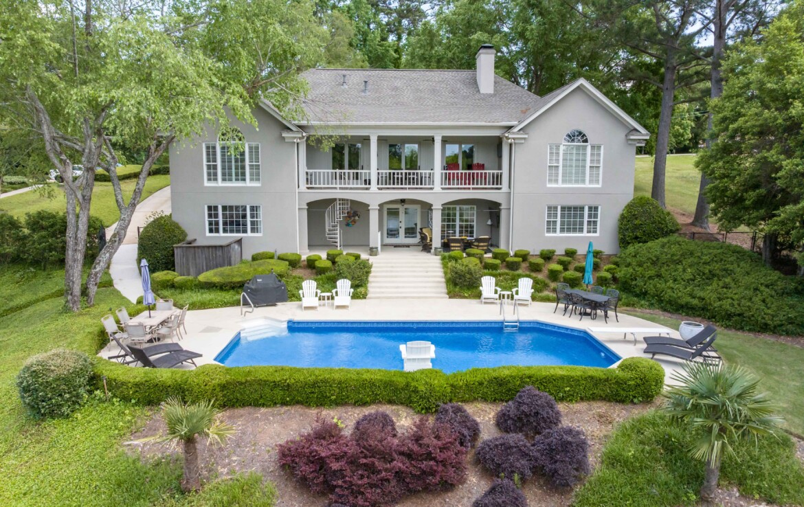 Exceptional Green Island waterfront residence offering breathtaking views of Lake Oliver in a prime, sought-after location. A gracious entry foyer opens to spacious living and dining areas, highlighted by a wall of windows with natural light and frame stunning lake views. French doors lead to a covered patio overlooking the water, creating seamless indoor-outdoor living. The updated kitchen features custom cabinetry, concrete countertops, high-end appliances, and a center island. An adjoining den with fireplace and built-ins provides a comfortable gathering space while enjoying panoramic lake views. Step onto the expansive covered porch overlooking the lake, saltwater pool, and beautifully manicured grounds—perfect for relaxing or entertaining. The main-level owner’s suite is a private retreat with lake views, custom ceiling details, hardwood floors, and a renovated luxury bath with custom cabinetry, soaking tub, and custom walk-in shower. An additional main-level bedroom with adjoining bath offers flexibility for guests or a home office. The lower level provides additional living space, including a large family room with fireplace that opens to a patio, pool, and outdoor entertaining area complete with a wet bar and half bath. Two spacious bedrooms with built-in cabinetry share a Jack-and-Jill bath, and a dedicated home gym or exercise room adds versatility. Additional features include approximately 5,127 heated and cooled square feet, four bedrooms, three full baths, and two half baths. The home showcases hardwood floors, crown molding, plantation shutters, three fireplaces, three living areas, and a large wet bar ideal for entertaining. Outdoor amenities include 146 feet of pristine water frontage, a new concrete seawall, saltwater swimming pool, covered patio and veranda with outdoor half bath and bar, single-bay enclosed boathouse, and stationary dock. A rare opportunity to enjoy refined lakefront living in one of the area’s most desirable communities!