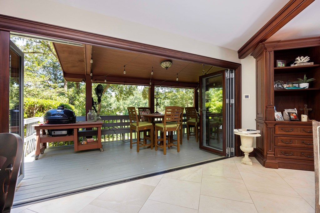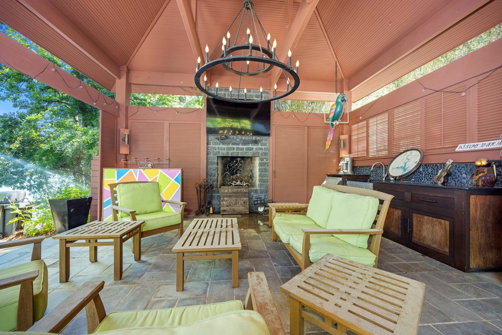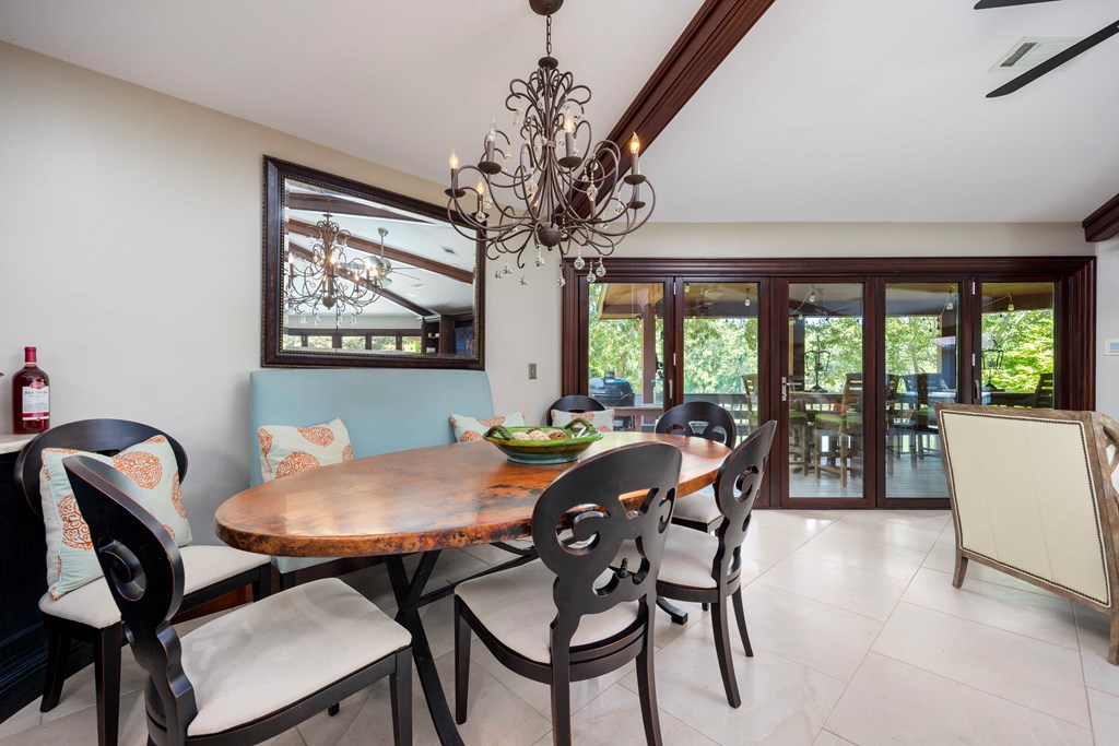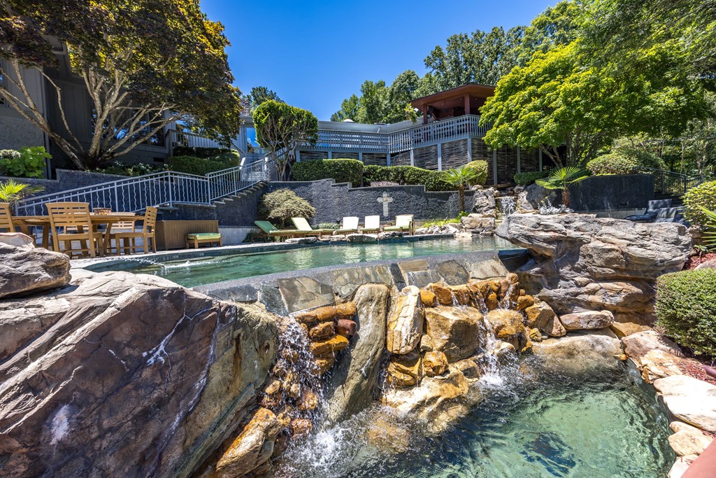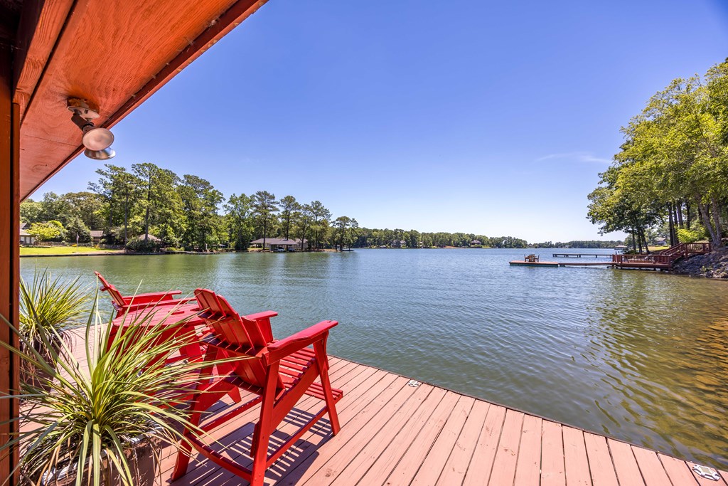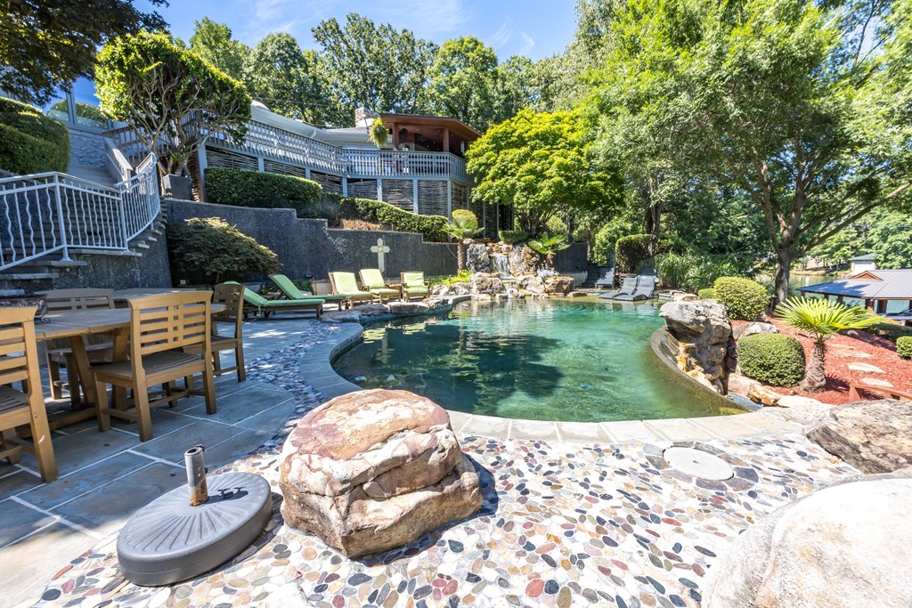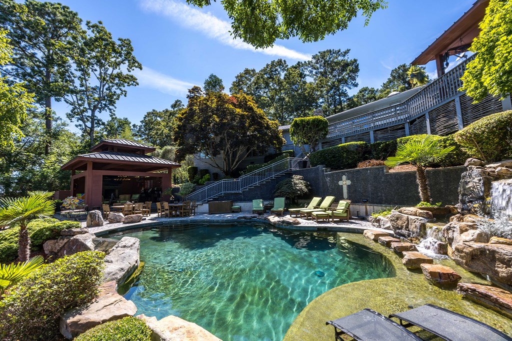 Experience grand lakefront luxury with this stunning waterfront home on Lake Harding. Situated on a private 2-acre lot with a gated entrance, this exceptional property features an open floor plan and a chef’s kitchen outfitted with premium Wolf, Sub-Zero, and Miele appliances, as well as built-in surround sound both indoors and out. The living area boasts accordion sliding doors that seamlessly blend indoor and outdoor spaces, leading to a spacious 551 sq ft covered deck, perfect for entertaining. Enjoy the infinity pool with a cascading waterfall, and relax at the covered pavilion complete with a fireplace and bar area featuring slate tile flooring. This property offers 328 feet of waterfront, including a double boathouse, floating dock, stationary dock, and a 4-car garage.