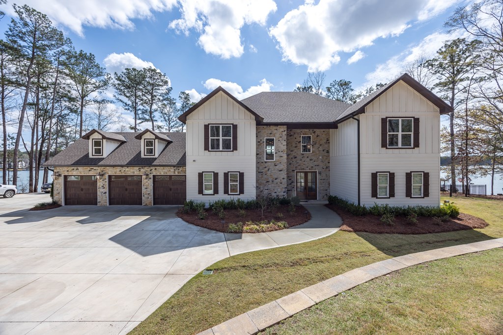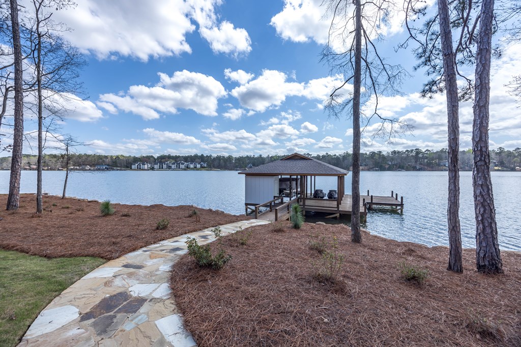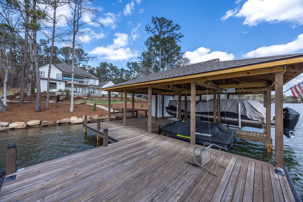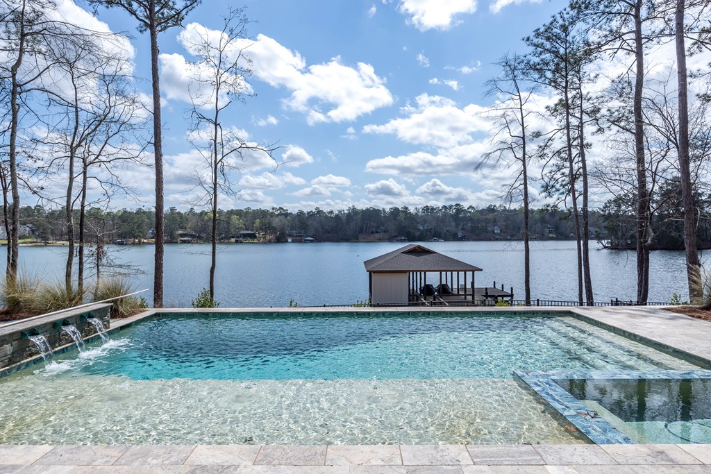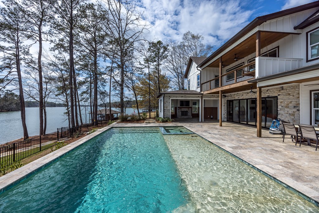 This one of a kind property offers you 22.7 deeded acres on Lake Harding in Harris County with a one year old custom built home on the lake. You are welcomed with stone pillars at the driveway that leads you down to the lake house. You have a three car oversized garage with ample storage along with ample parking for your guests. Walking through the front door you enter into the foyer and then the great room with 20′ + ceilings with large windows looking out to the lake. The open kitchen is to your left which features granite counters plus an island with a farm house style sink. All top end stainless appliances to include side by side refrigerator, dishwasher, microwave, oven and soft ice maker plus a wine cooler. There is even a butlers kitchen off of the kitchen with ample storage and a large laundry room adjacent and then a full bathroom for guests. All the rest of the ceilings are 10′ with crown molding. On the main level there are two primary bedrooms both with large nice bathrooms….The larger primary bedroom has a large bathroom with a double shower and a stand alone tub and a serious walk-in closet. Upstairs has two other bedrooms and an office that could b e a bedroom plus a large entertainment room with a wet bar with a wine cooler. Opening the sliding glass doors that open all the way you walk out to the pool area that has a large covered back area plus to the right is a covered outdoor cooking area with stainless grill, wine cooler, etc.. plus a half bathroom. The pool is a Gunite top of the line pebble tech finish with a Walk down to the boathouse to your slip for your pontoon and one for your jet skis, both with lifts included. If you are looking for the perfect family get-away or a full time residence, this is made for you and your family.