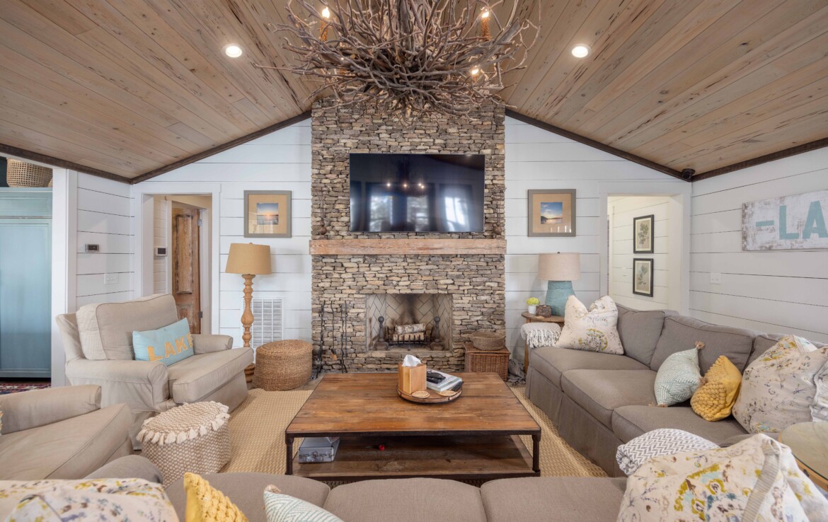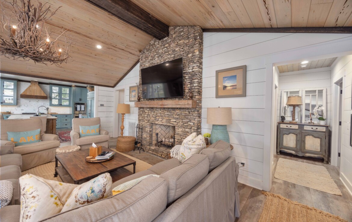 Spectacular waterfront home with big water views on 1.6 acres! Offering tons of charm and character with 3 bedrooms and 3.5 bathrooms, this home features an open-concept great room with shiplap walls, a wet bar, and a wood-burning fireplace. The spacious kitchen and dining area are perfect for gathering, complete with custom cabinetry, a large island, gas range, double ovens, and a butler’s pantry. Step outside to enjoy the large, screened porch, expansive entertaining decks, double boathouse, and both a stationary and floating dock—everything you need for lake living at its best.